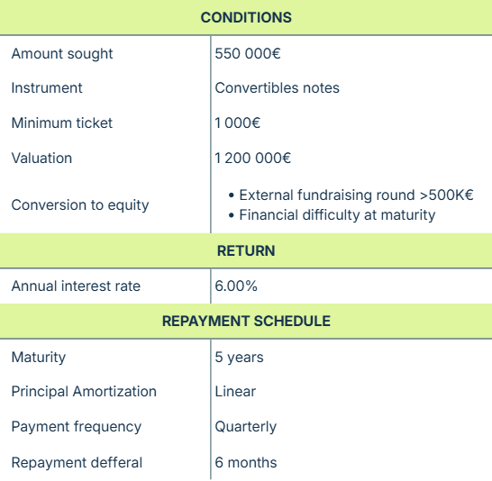A detailed quarter-by-quarter amortization schedule will be provided to each investor after subscription. It is also available in the Technical Sheet (appendix to the investment dossier).CONVERSION OPTIONS (OPTIONAL CLAUSE):