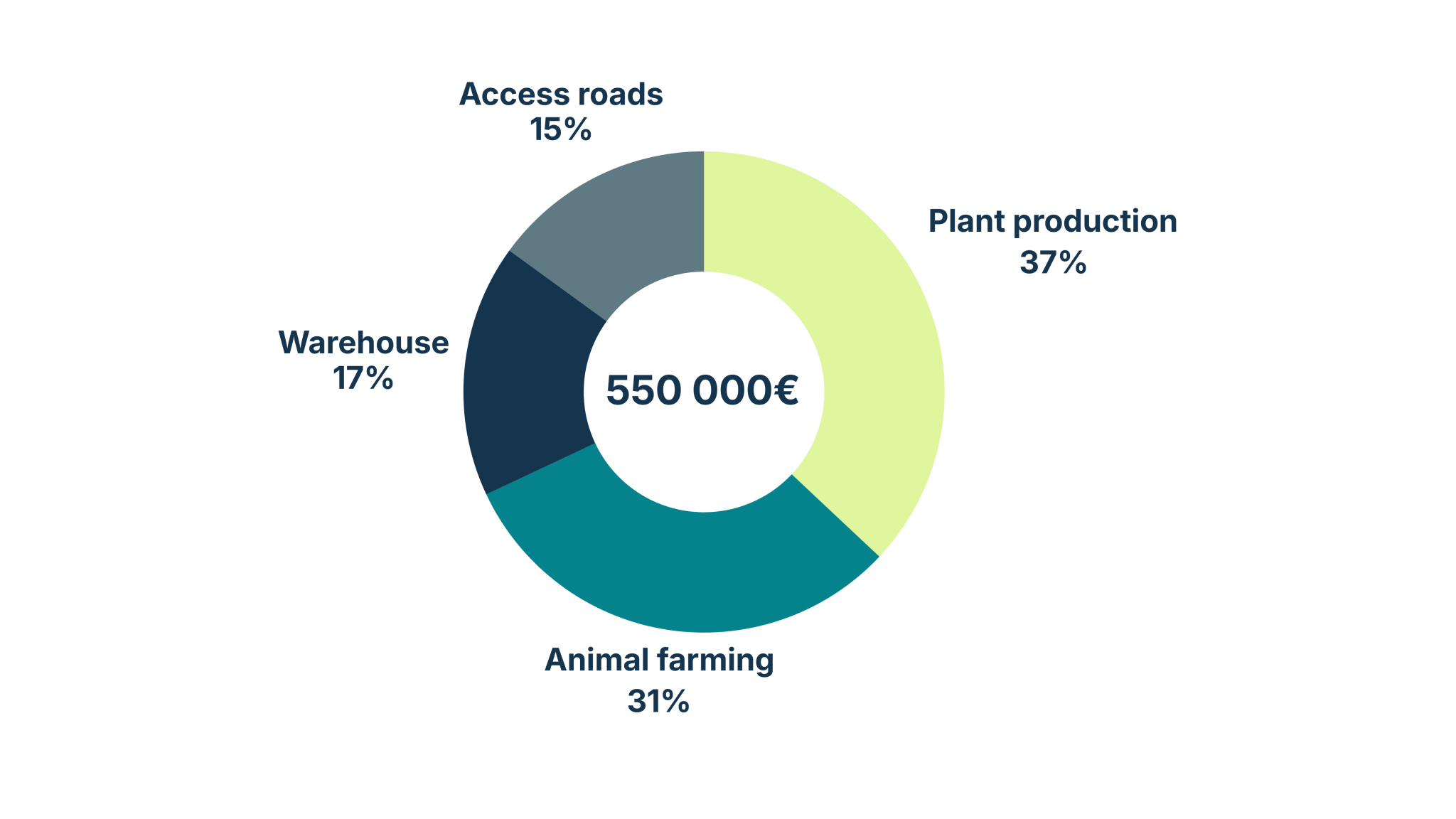 The funds raised will complement FEADER financing (European Agricultural Fund for Rural Development, covering 80%) to accelerate the operational deployment of the farm and secure its growth drivers. They will finance the following strategic areas:❇️ Plant production division (37%) : establishment of perennial plantations, irrigation systems, greenhouses and basins, all oriented toward regenerative agriculture and climate-resilient production.