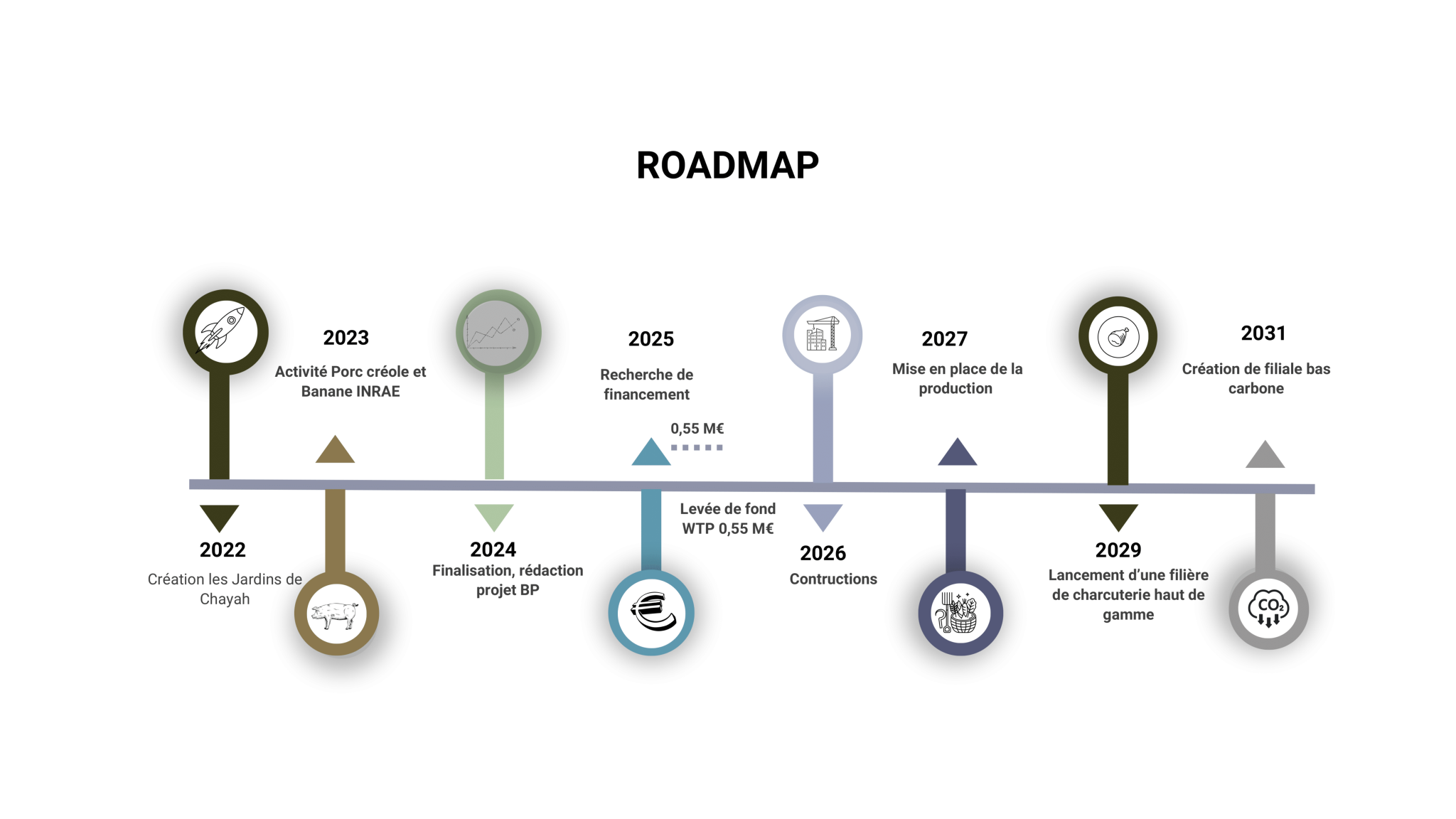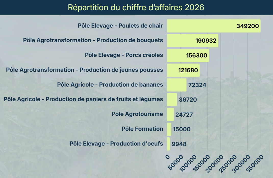 ❇️ Elevage (31%) : développement d’un pôle animal structuré autour du poulet chair, des pondeuses et du porc créole, en cohérence avec l’autonomie alimentaire, la production locale et la valorisation des races patrimoniales.